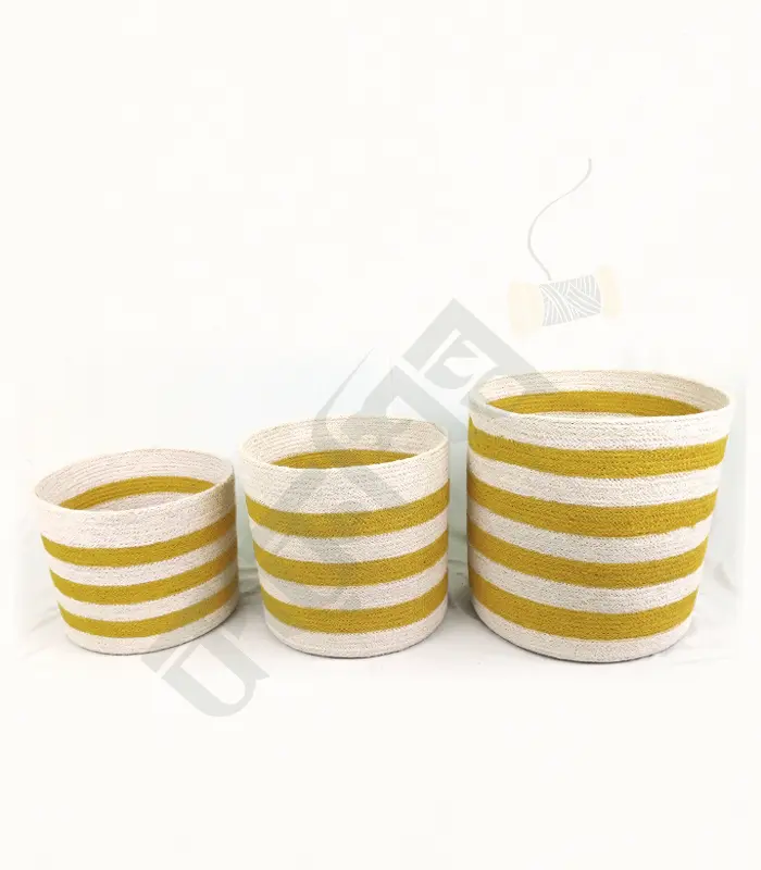 Jute Cylinder Planter White with Yellow Stripes set of 3